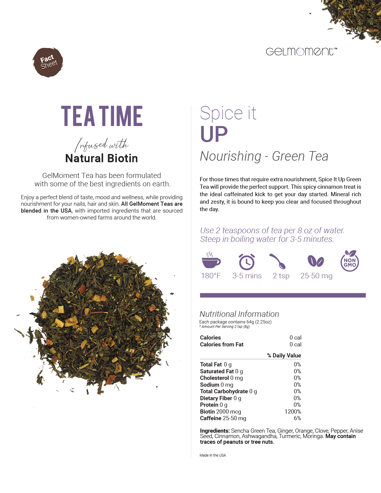 Sencha green tea, ginger, orange, clove, pepper, anise seed, cinnamon, ashwagandha, turmeric, moringa, orange extract.